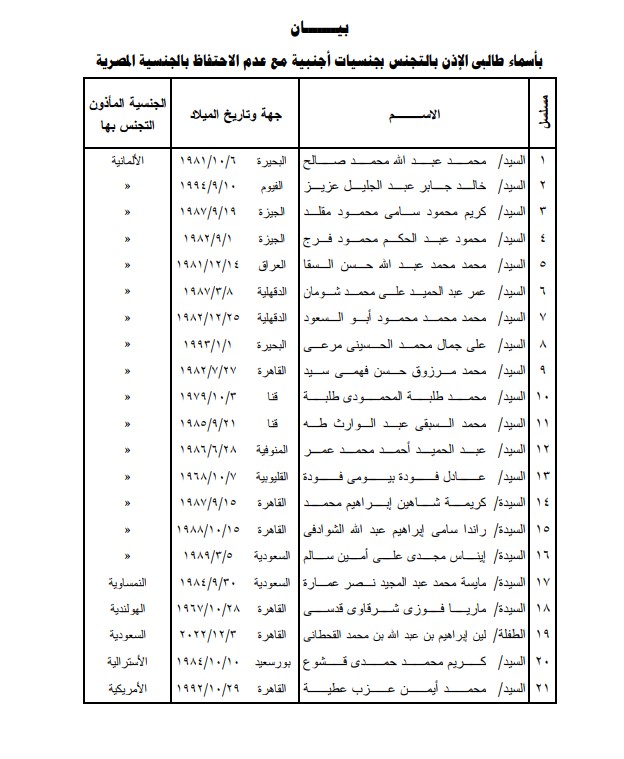 إسقاط الجنسية المصرية عن 21 مواطنا للسماح لهم بالحصول على جنسيات أجنبية| مستند