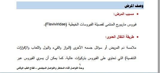 كشفت وزارة الصحة والسكان ممثلة في قطاع الطبي الوقائي، طرق انتقال عدوى الإصابة بفيروس ماربورغ أو ماربورج، وفقا للدليل الإرشادي للتعامل مع المرض.