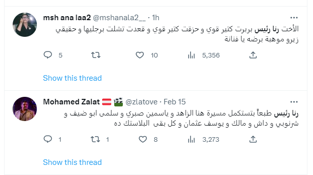 واعترضت عدد من المغردين على أداء رنا رئيس في التمثيل بمسلسل أزمة منتصف العمر، وقال أحدهم: رنا رئيس دي زيرو كاريزما وتمثيل وكل حاجة، وآخر: مش هتكلم عن رنا رئيس طبعًا، جريمة مكتملة الأركان واللي دخلها التمثيل مش هيورد على جنة، وآخر: رنا رئيس أكتر واحدة المفروض نتعاطف معاها في المسلسل مش عارفين بسبب تمثيلها ده.