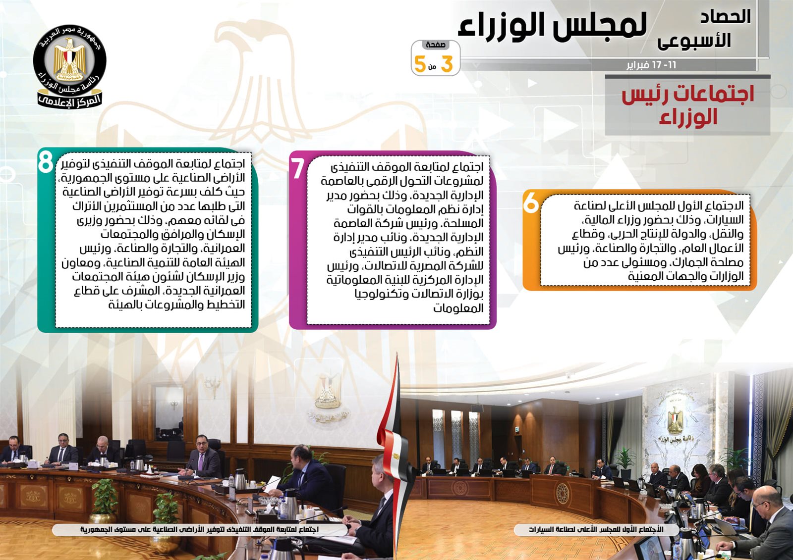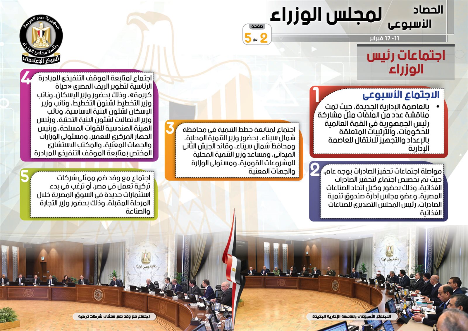 نشر المركز الإعلامي لمجلس الوزراء، تقريرًا شمل إنفوجرافات سلط من خلالها الضوء على الحصاد الأسبوعي لمجلس الوزراء، وذلك خلال الفترة من 11 حتى 17 فبراير 2023، والذي تضمن الموافقة على عدد من القرارات، فضلًا عن الاجتماعات واللقاءات التي عقدها الدكتور مصطفى مدبولي، رئيس مجلس الوزراء، بالإضافة إلى ما أجراه من أنشطة.