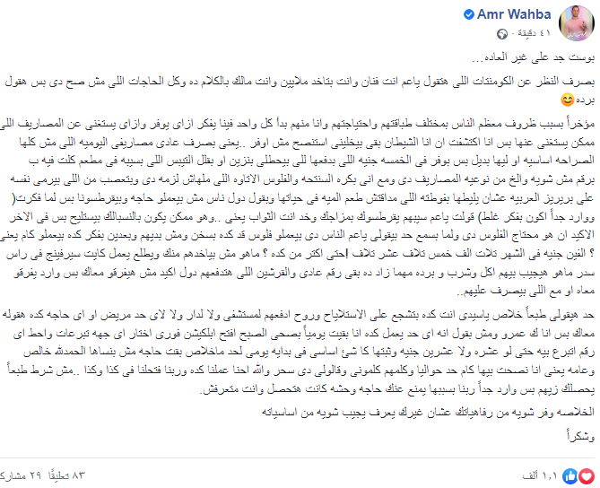 وكتب عمرو وهبة، منشورًا عبر حسابه الشخصي بموقع التواصل الاجتماعي فيسبوك، جاء فيه: بوست جد على غير العادة.. بصرف النظر عن الكومنتات اللى هتقول يا عم أنت فنان وأنت بتاخد ملايين وأنت مالك بالكلام ده وكل الحاجات اللى مش صح دى بس هقول برده.