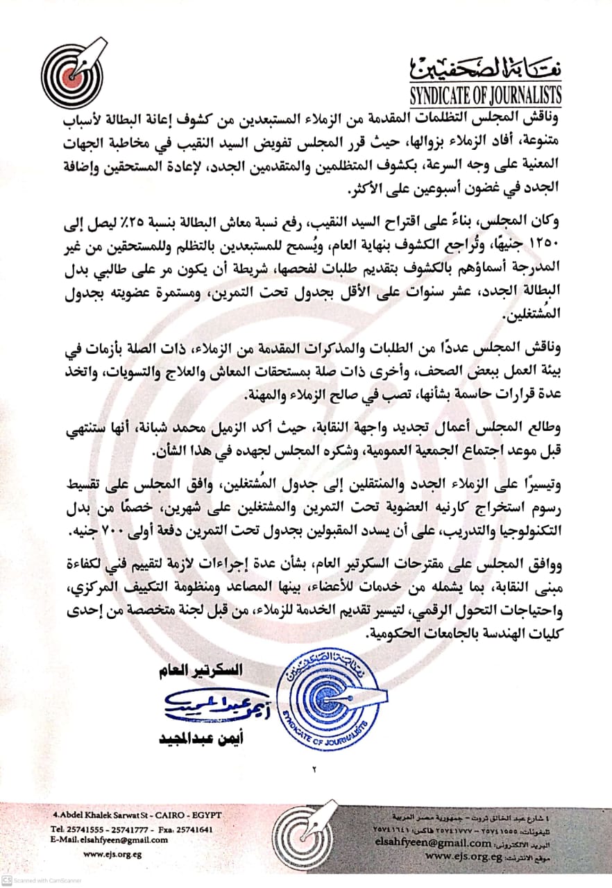 وكان المجلس، بناءً على اقتراح السيد النقيب، رفع نسبة معاش البطالة بنسبة 25% ليصل إلى 1250 جنيهًا، وتُراجع الكشوف بنهاية العام، ويُسمح للمستبعدين بالتظلم وللمستحقين من غير المدرجة أسماؤهم بالكشوف بتقديم طلبات لفحصها، شريطة أن يكون مرّ على طالبي بدل البطالة الجدد عشر سنوات على الأقل بجدول تحت التمرين، ومستمرة عضويته بجدول المُشتغلين.