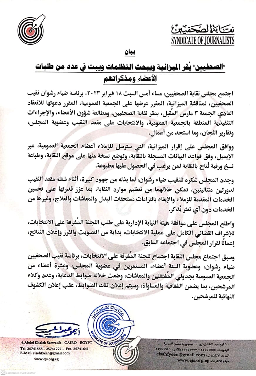 ووافق المجلس على إقرار الميزانية، التي سترسل للزملاء أعضاء الجمعية العمومية، عبر الإيميل، وفق قواعد البيانات المسجلة بالنقابة، وتوضع نسخة منها على موقع النقابة، وطباعة نسخ ورقية تُتاح بالنقابة لمن يرغب في الحصول عليها مطبوعة.