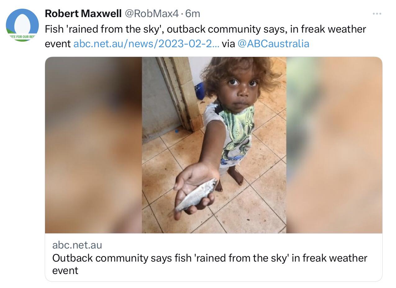 بدأت السماء أمس الثلاثاء الموافق 21 فبراير، تمطر سمكًا في حدث غريب جدًا في بلدة أسترالية في لاجامانو، مما دفع السكان المحليين للشعور بالحيرة الكبيرة، ليعد هذا الحدث من أغرب الظواهر التي تمر على تلك القرية.