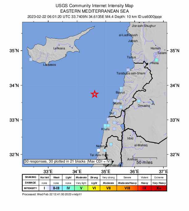 وقالت الهيئة الأمريكية، إن الهزة الأرضية جاءت بعمق 10 كيلو مترات غرب مدينة صيدا، دون الإفصاح عن وقوع تغيرات في ارتفاع منسوب المياه بالبحر المتوسط جراء الهزة الأرضية.