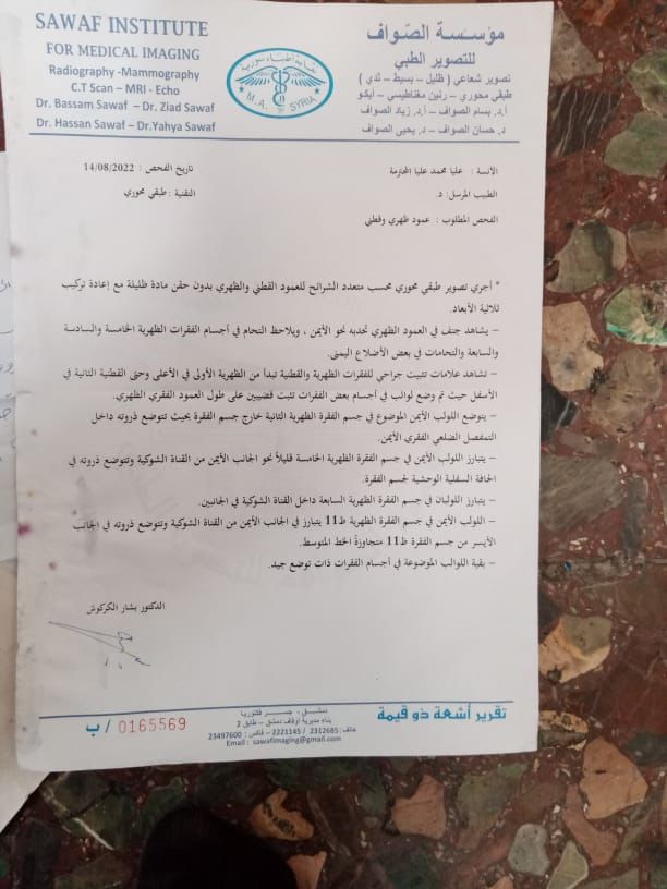 تعرضت فتاة سورية لحادث مأساوي، أصيبت على إثره بإصابات بالغة في العمود الفقري، حيث تعاني من جنف في العمود الظهري نحو الأيمن، والتحام في أجسام الفقرات الظهرية الخامسة والسادسة والسابعة، والتحامات في بعض الأضلاع اليمني.