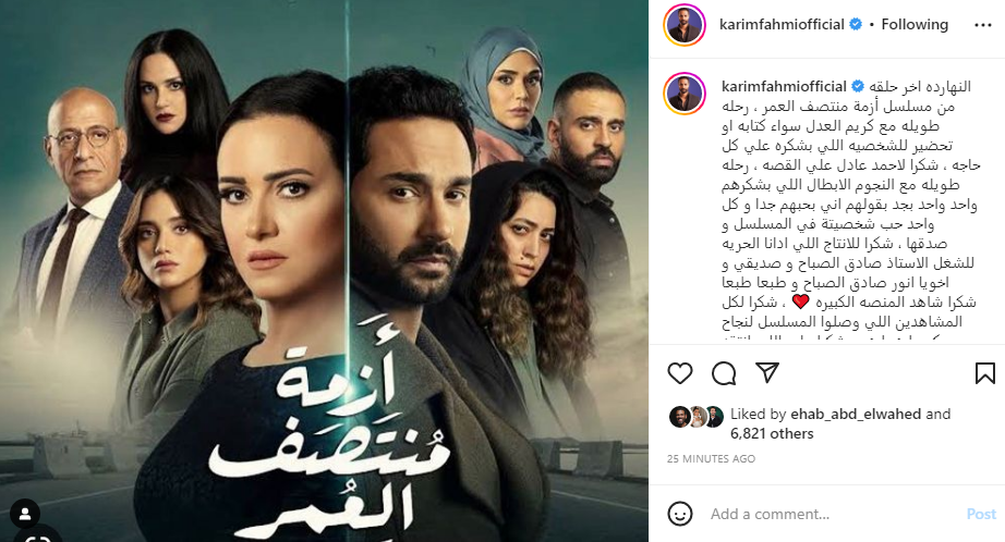ونشر كريم فهمي على حسابه الرسمي بـ انستجرام بوستر المسلسل، معلقًا: النهاردة آخر حلقة من مسلسل أزمة منتصف العمر، رحله طويلة مع كريم العدل سواء كتابة أو تحضير للشخصية اللي بشكره عل كل حاجة.