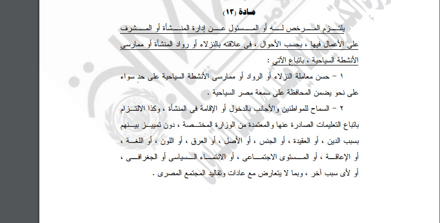 كما ألزم القانون بالسماح للمواطنين والأجانب بالدخول أو الإقامة فى المنشأة، وكذا الالتزام باتباع التعليمات الصادرة عنها والمعتمدة من الوزارة المختصة، دون تمييز بينهم بسبب الدين، أو العقيدة، أو الجنس، أو الأصل، أو العرق، أو اللون، أو اللغة، أو الإعاقة، أو المستوى الاجتماعي، أو الانتماء السياسي أو الجغرافي، أو لأي سبب آخر، وبما لا يتعارض مع عادات وتقاليد المجتمع المصري.