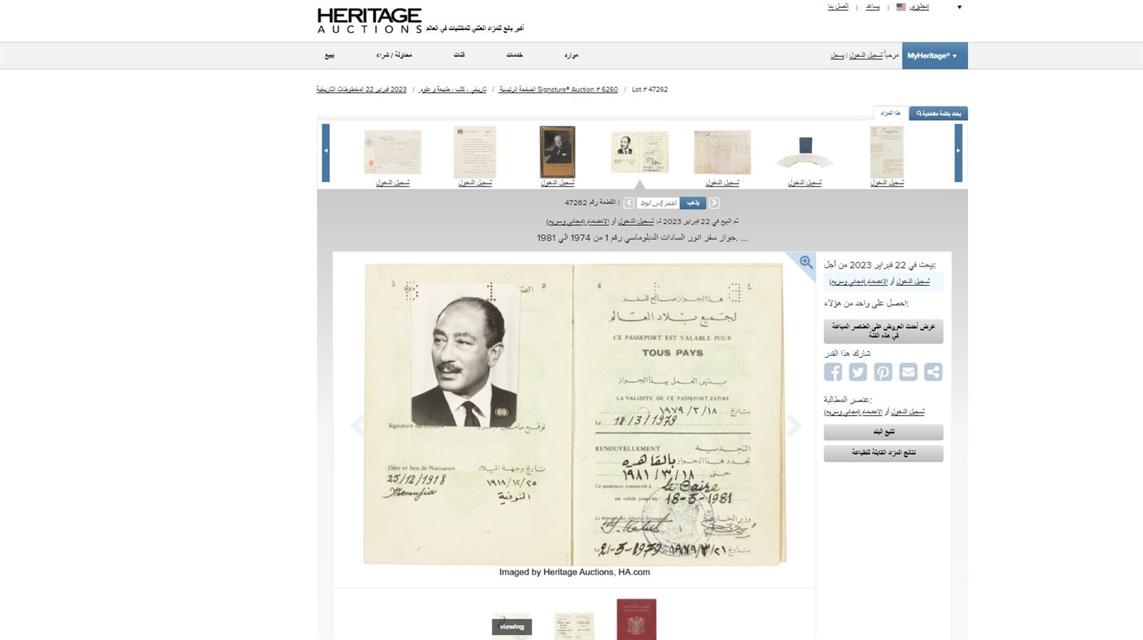 أعلنت صالة المزادات الأمريكية هيريتدج، الموجودة بولاية تكساس، بيع جواز سفر الرئيس المصري الأسبق محمد أنور السادات، بـ 47.500 دولار، يوم 22 فبراير 2023.
