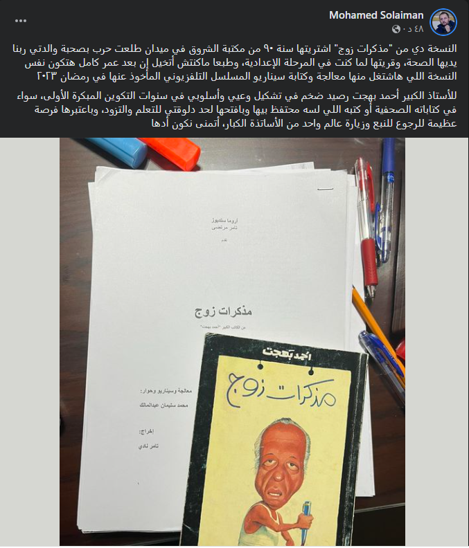 وأضاف محمد سليمان عبد المالك: طبعا ماكنتش أتخيل أن بعد عمر كامل هتكون نفس النسخة اللي هاشتغل منها معالجة وكتابة سيناريو المسلسل التليفزيوني المأخوذ عنها في رمضان 2023، مضيفا: للأستاذ الكبير أحمد بهجت رصيد ضخم في تشكيل وعيي وأسلوبي في سنوات التكوين المبكرة الأولى، سواء في كتاباته الصحفية أو كتبه اللي لسه محتفظ بيها وبفتحها لحد دلوقتي للتعلم والتزود، وباعتبرها فرصة عظيمة للرجوع للنبع وزيارة عالم واحد من الأساتذة الكبار، أتمنى نكون أدها.