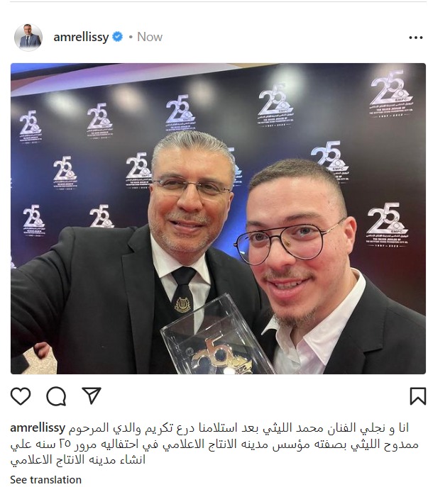 وحرص الإعلامي عمرو الليثي على التواجد مع نجله وتسلمه جائزة تكريم والده الراحل ممدوح الليثي، ونشر صوره تجمعه مع نجله، من خلال حسابه الشخصي بموقع الصور والفيديوهات إنستجرام، قائلًا: أنا ونجلي الفنان محمد الليثي بعد استلامنا درع تكريم والدي المرحوم ممدوح الليثي بصفته مؤسس مدينة الإنتاج الإعلامي في احتفالية مرور ٢٥ سنة على إنشاء مدينه الإنتاج الإعلامي.