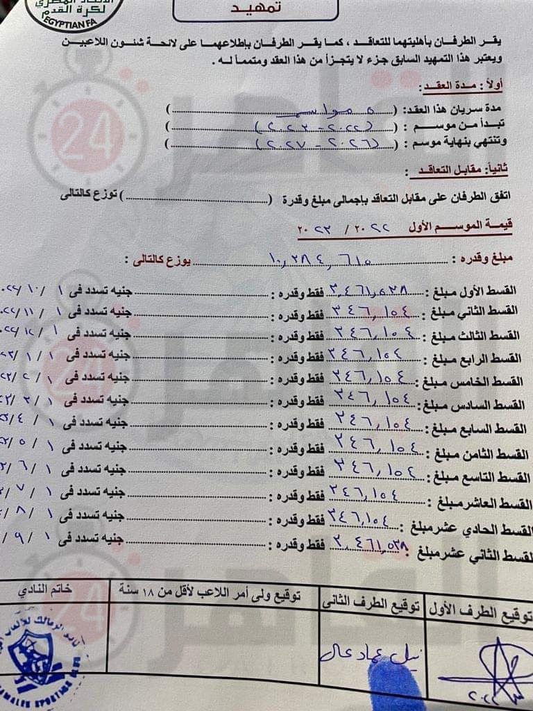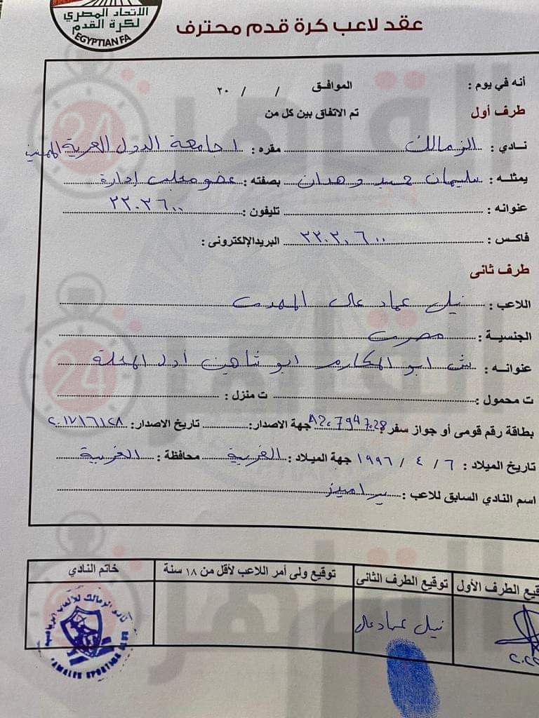 حصل القاهرة 24، على عقد نبيل عماد دونجا لاعب الفريق الأول لكرة القدم بنادي الزمالك، القادم إلى القلعة البيضاء، مع بداية الموسم من نادي بيراميدز.