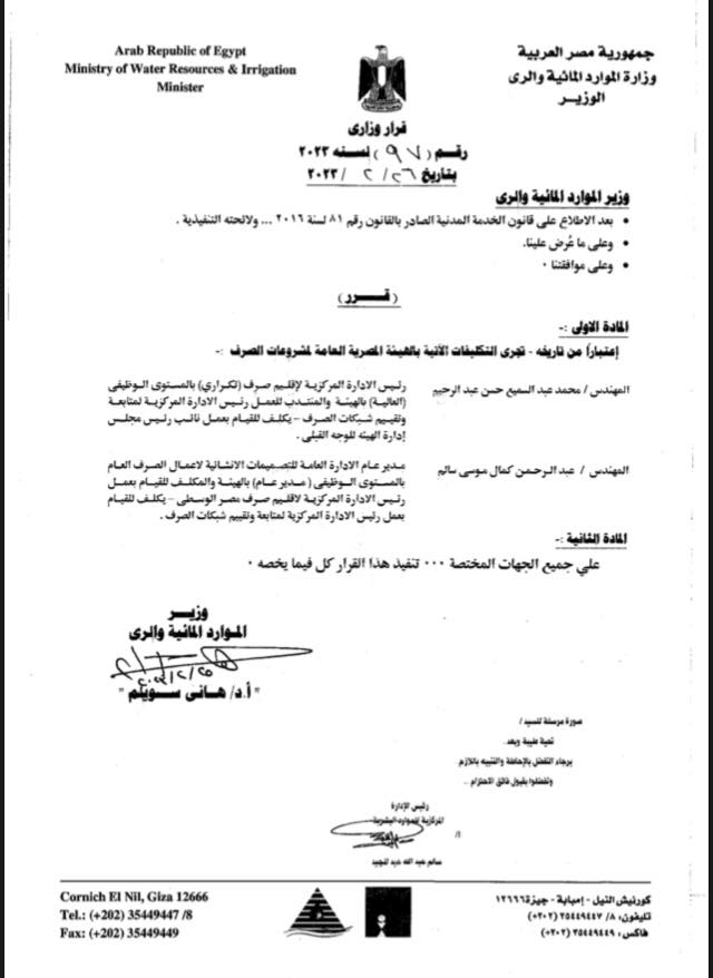 وأوضح المستند، أنه تم تكليف المهندس محمد عبد السميع حسن عبد الرحيم، والذي يعمل حاليا رئيس الإدارة المركزية لإقليم صرف تكراري بالمستوى الوظيفي العالية بالهيئة، للقيام بعمل نائب رئيس مجلس إدارة الهيئة للوجه القبلي.