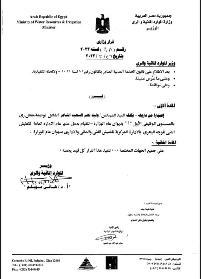 وأكد المستند، أنه تم تكليف وليد نصر السعيد الشاعر الشاغل حاليا لوظيفة مفتش ري بالمستوى الوظيفي الأول أ بديوان عام الوزارة، للقيام بعمل مدير عام الإدارة العامة للتفتيش الفني للوجه البحري بالإدارة المركزية للتفتيش الفني والمالي والإداري بديوان عام الوزارة.