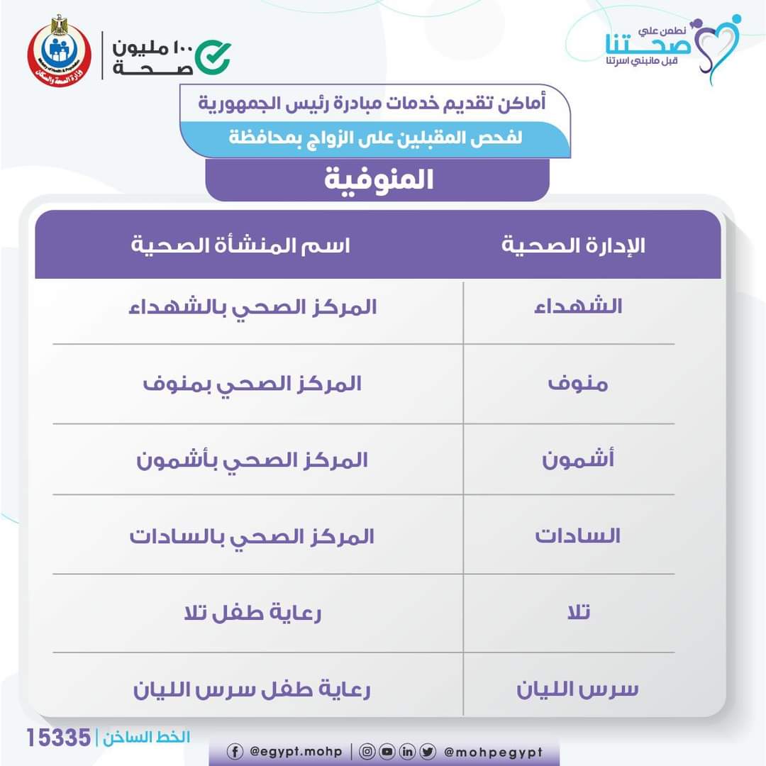 أماكن فحص المقبلين على الزواج بالمنوفية