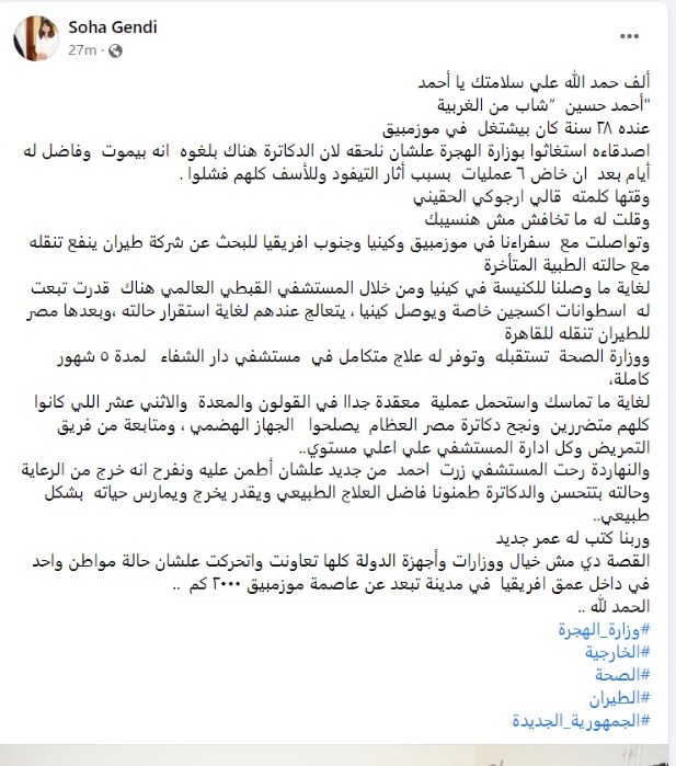 وقالت وزيرة الهجرة، عبر صفحتها الرسمية على موقع التواصل الاجتماعي فيسبوك: ألف حمد الله على سلامتك يا أحمد، وتابعت: بعد استغاثت أصدقائه وقتها كلمته قالي أرجوكي الحقيني، وقلت له ما تخافش مش هنسيبك، وتواصلت مع سفرائنا في موزمبيق وكينيا وجنوب إفريقيا للبحث عن شركة طيران ينفع تنقله مع حالته الطبية المتأخرة.