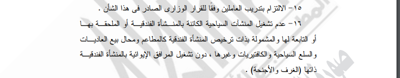 ألزم قانون المنشآت السياحية والفندقية، الصادر بالقانون رقم 8 لسنة 2022، المنشآت بتدريب العاملين وفقا للقرار الوزارى الصادر في هذا الشأن، مشددًا على أهمية عدم تشغيل المنشآت السياحية الكائنة بالمنشأة الفندقية أو الملحقة بهـا أو التابعة لها والمشمولة بذات ترخيص المنشأة الفندقية كالمطاعم ومحال بيع العاديات والسلع السياحية والكافتيريات وغيرها، دون تشغيل المرافق الإيوائية بالمنشأة الفندقية ذاتها الغرف والأجنحة.