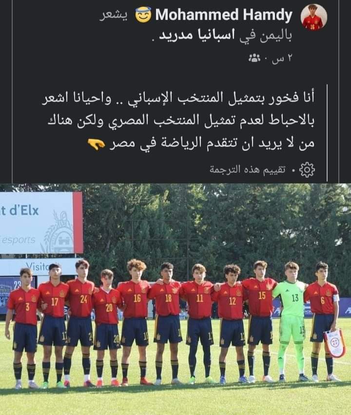 وكتب الحساب على موقع التواصل الاجتماعي فيس بوك: أنا فخور بتمثيل المنتخب الإسباني، وأحيانا أشعر بالإحباط لعدم تمثيل المنتخب المصري ولكن هناك من لا يريد أن تتقدم الرياضة في مصر.