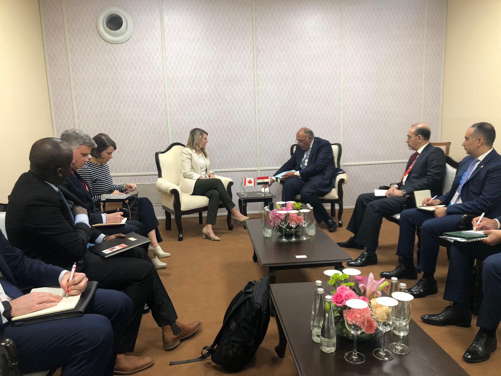 كما التقى بوزيرة الخارجية الكندية ميلانى جولى، على هامش اجتماع وزراء خارجية مجموعة العشرين، حيث شهد اللقاء إشادة شكري بالتعاون الاقتصادي والأكاديمي بين البلدين، مرحبًا بالتشاور والتنسيق حيال مختلف القضايا الدولية.