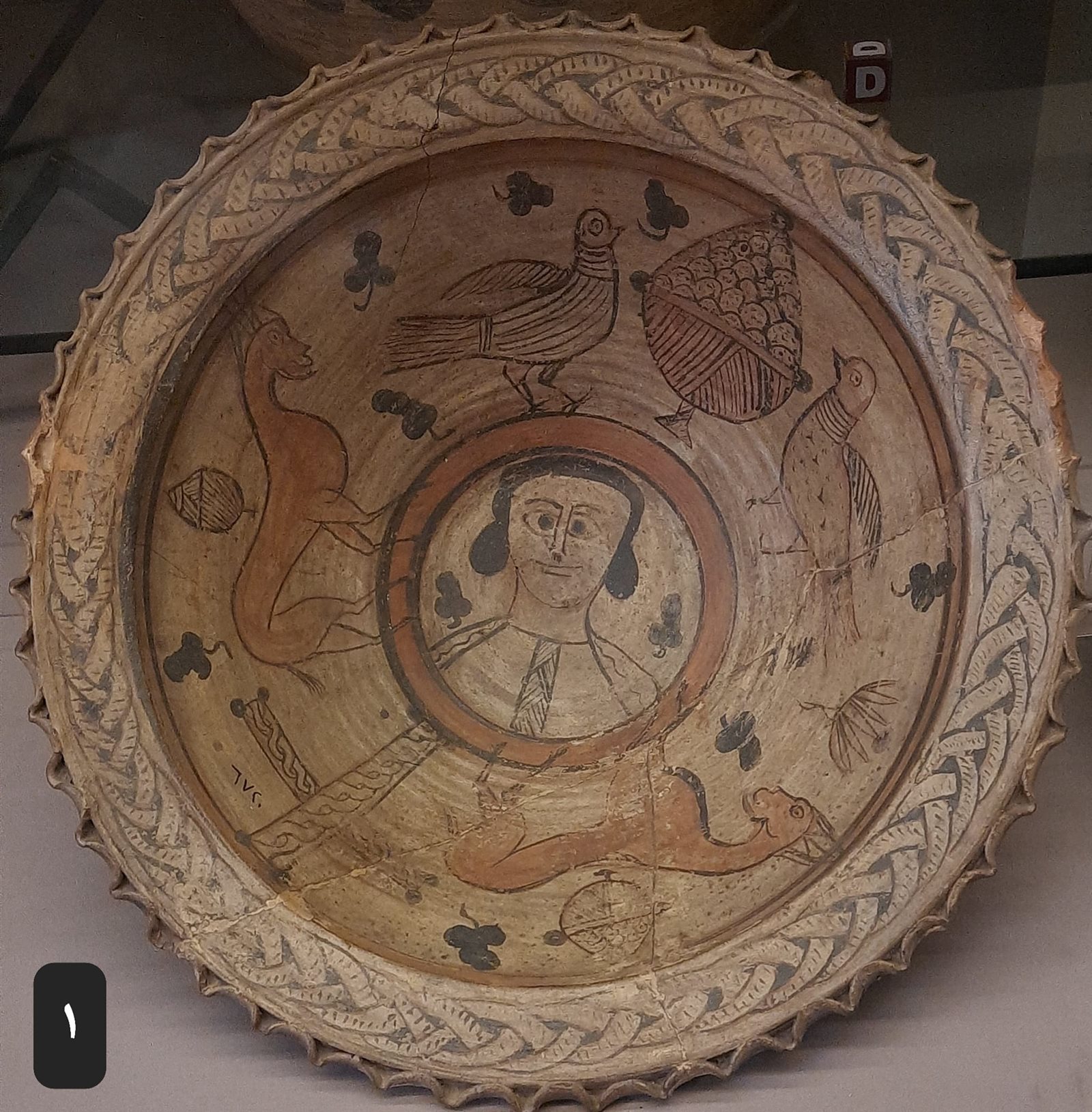 - طبق من الفخار عليه رسم بالداخل لسيدة، يليها صف من رسوم لسلة خبز وحيوانات وطيور وعناصر نباتية، وعلى شفة الطبق زخرفة بشكل مُضفر، وتعود القطعة إلى القرن 8 م.
