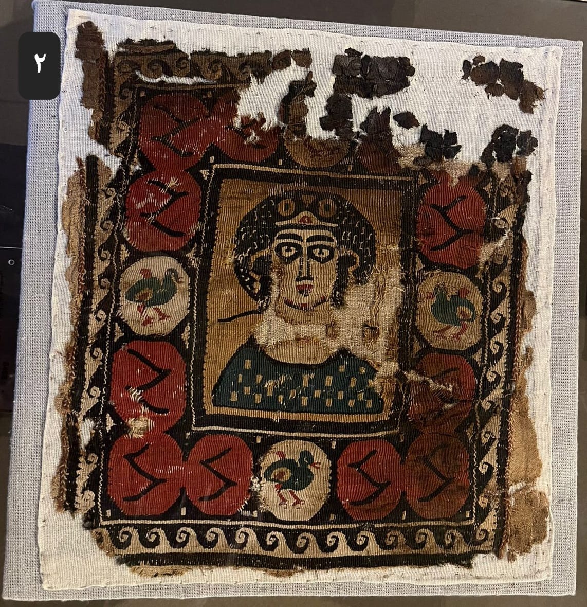 - قطعة من النسيج القباطي عليها زخارف نصفية لسيدة حولها أربع جامات تحوي طيورًا، وتعود القطعة إلى الفترة ما بين الفرنين 4-5 م.