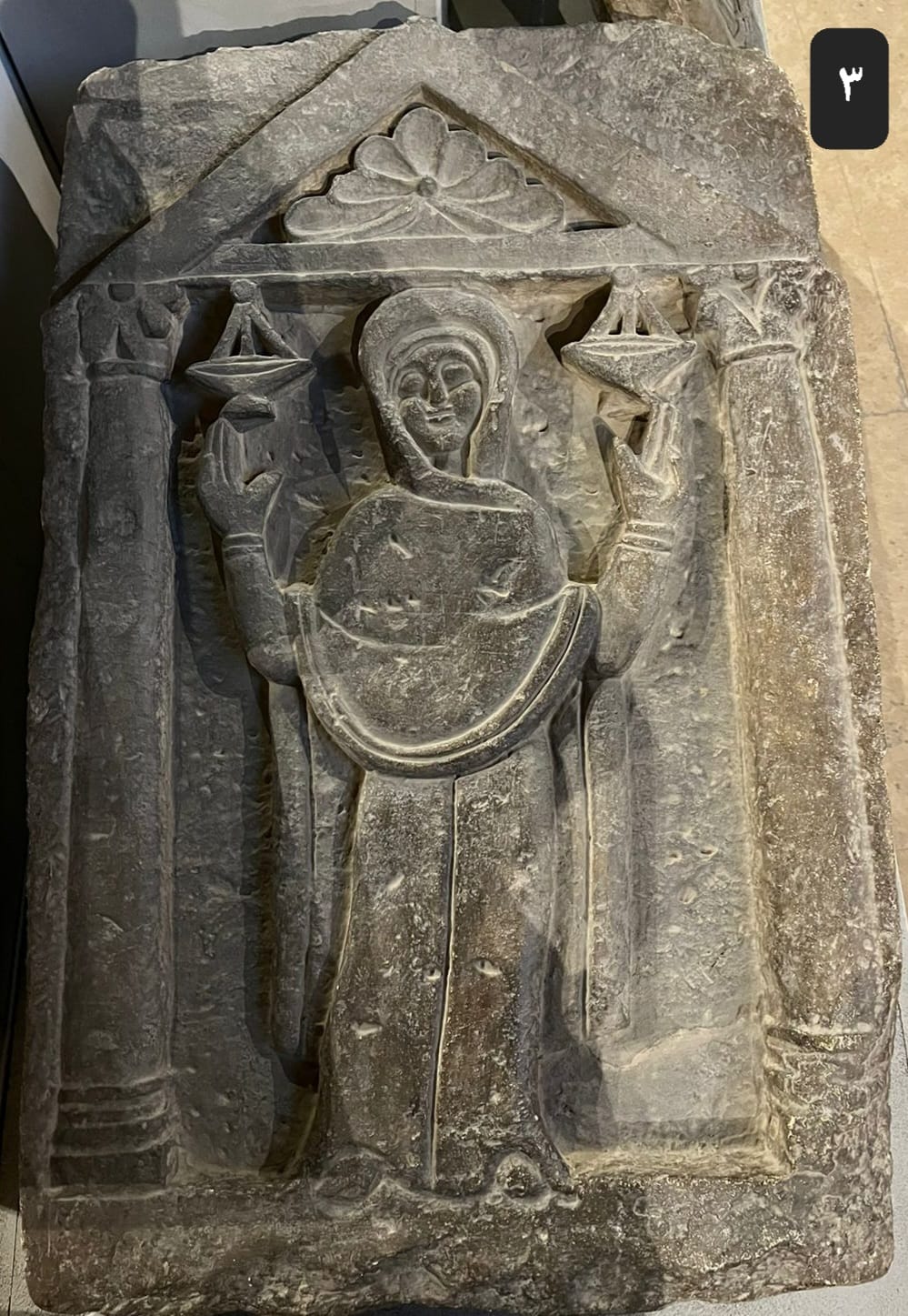 - شاهد قبر من الحجر الجيري عليه نقش لسيدة متوفاة تقف رافعة يديها في وضع التعبد داخل إطار قوامه عمودان عليهما واجهة مثلثة بداخلها صدفة، وتعود القطعة إلى القرن 8 م.