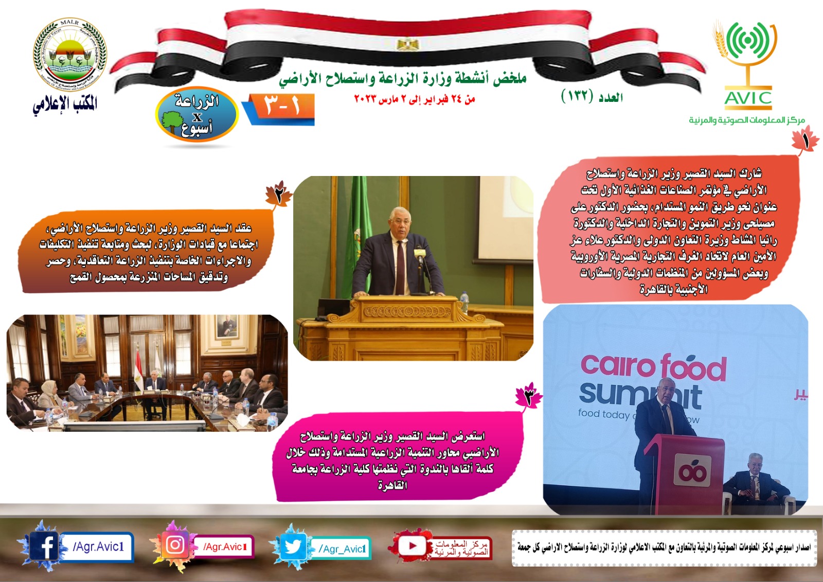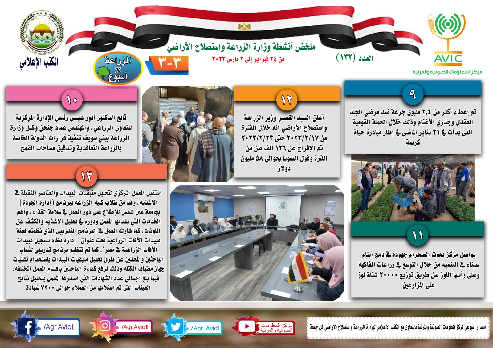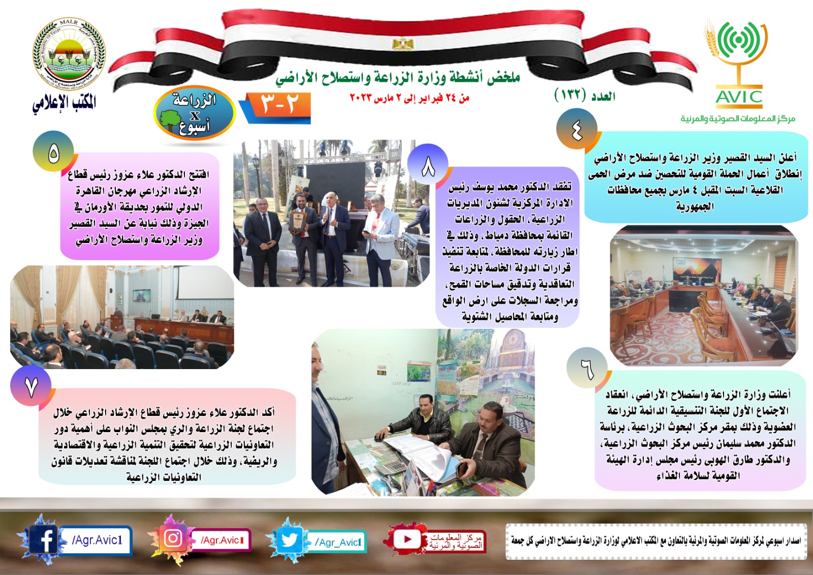 أصدر مركز المعلومات الصوتية والمرئية، التابع لوزارة الزراعة واستصلاح الأراضي، الانفوجراف الأسبوعي، في نسخته رقم 132، حول الحصاد الأسبوعي لأهم أنشطة الوزارة، خلال الأسبوع الماضي في الفترة من 24 فبراير وحتى 3 مارس الجاري، وذلك بالتعاون مع المكتب الإعلامي للوزارة.