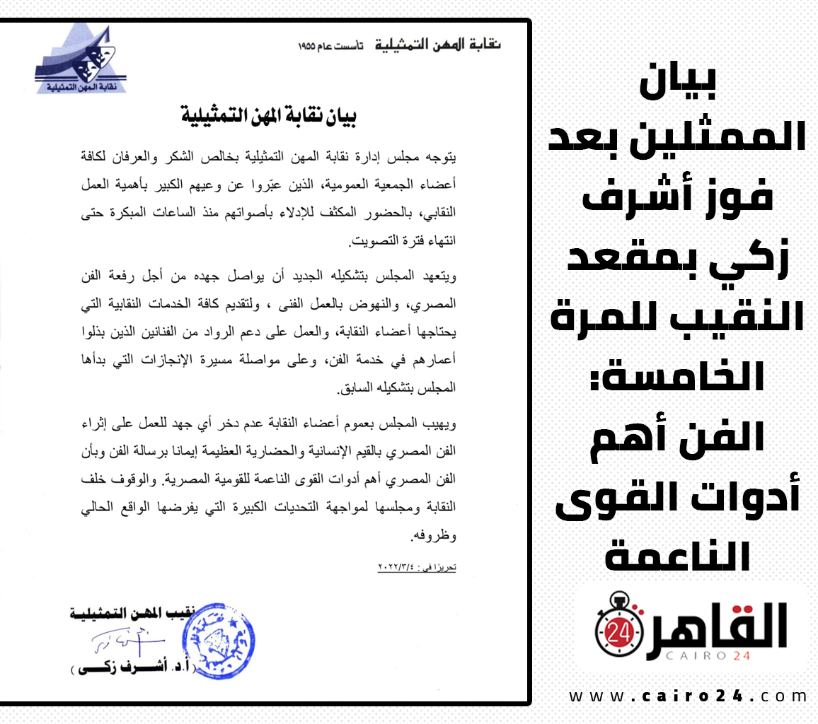 وقالت المهن التمثيلية في بيانها الصادر عن رئيسها الدكتور أشرف زكي: بيان نقابة المهن التمثيلية، يتوجه مجلس إدارة نقابة المهن التمثيلية بخالص الشكر والعرفان لكافة أعضاء الجمعية العمومية، الذين عبروا عن وعيهم بأهمية العمل النقابي بالحضور المكثف للإدلاء بأصواتهم منذ الساعات المبكرة حتى انتهاء فترة التصويت.