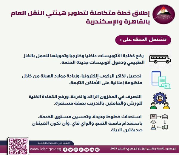 سلط مركز معلومات مجلس الوزراء، في تقرير صادر له على إطلاق خطة متكاملة لتطوير هيئتي النقل العام بالقاهرة والإسكندرية، والتي تأتي في إطار تنفيذ توجيهات القيادات السيادية، لتطوير منظومة النقل الجماعي من خلال هيئتي النقل العام بالقاهرة والإسكندرية، والتوسع في استخدام الأتوبيسات صديقة البيئة.