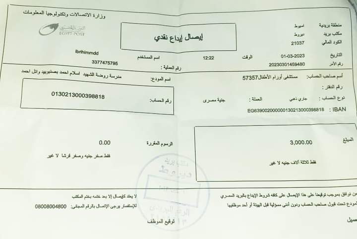 وتضمن الإيصال إيداع نقدي بقيمة 3 آلاف جنيه باسم مدرسة روضة الشهيد إسلام أحمد بصنبو، في حساب مستشفى أورام الأطفال 57357، وذلك من خلال مكتب البريد.