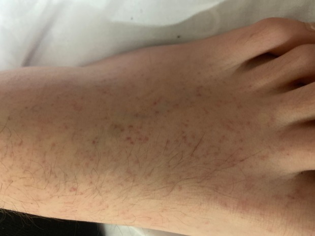قالت والدة الطفل، إن الطفح الجلدي بدا وكأنه بقع، وكأن دمه قد نزل إلى سطح الجلد، وقد أعطى الأطباء المراهق الديازيبام للمساعدة في تخفيف الألم، لكن جيسيكا قالت إن ابنها لا يزال يعاني لدرجة أنه يبكي في غرفته في الليل، وقد تدهورت حالة حتى وصل إلى أنه لا يستطيع المشي، حيث كان يعاني من ألم شديد.
