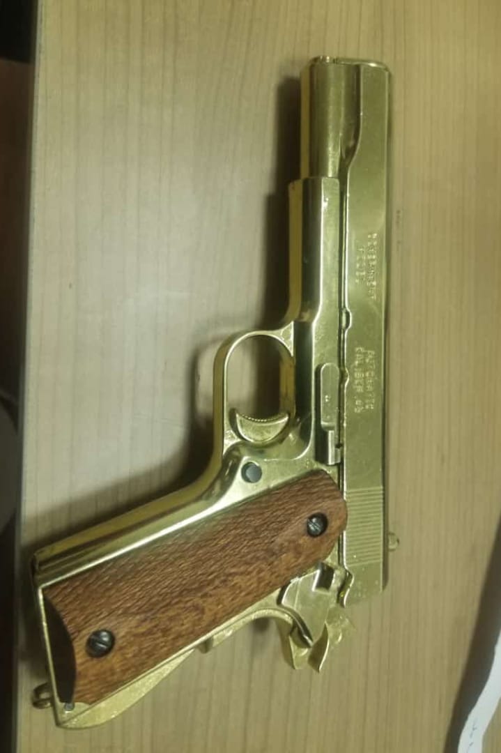 وكلف مدير الحركة المشرف على صالة الوصول بمبني الركاب رقم 3 عبد الله حمدي مأمور الجمرك بتفتيش حقائب الراكب يدويا، مما أسفر عن ضبط سلاح ناري من معدن أصفر اللون يشتبه أن يكون معدن الذهب، وعرض أحمد أبو بكر فؤاد مدير الجمرك على إدارة الحماية المدنية بالمطار والذي أفاد تقريره بأنه مسدس عيار 45 محظور حيازته طبقا للقانون رقم 394 لسنة 1954.