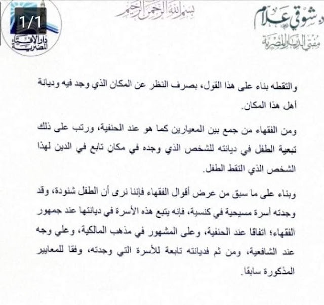 وكان قد تداول عدد من مستخدمي مواقع التواصل الاجتماعي فيسبوك، منشورًا بمستند للدكتور شوقي علام مفتي الجمهورية، به فتوى تفيد بأن الطفل شنودة مسيحيًا.