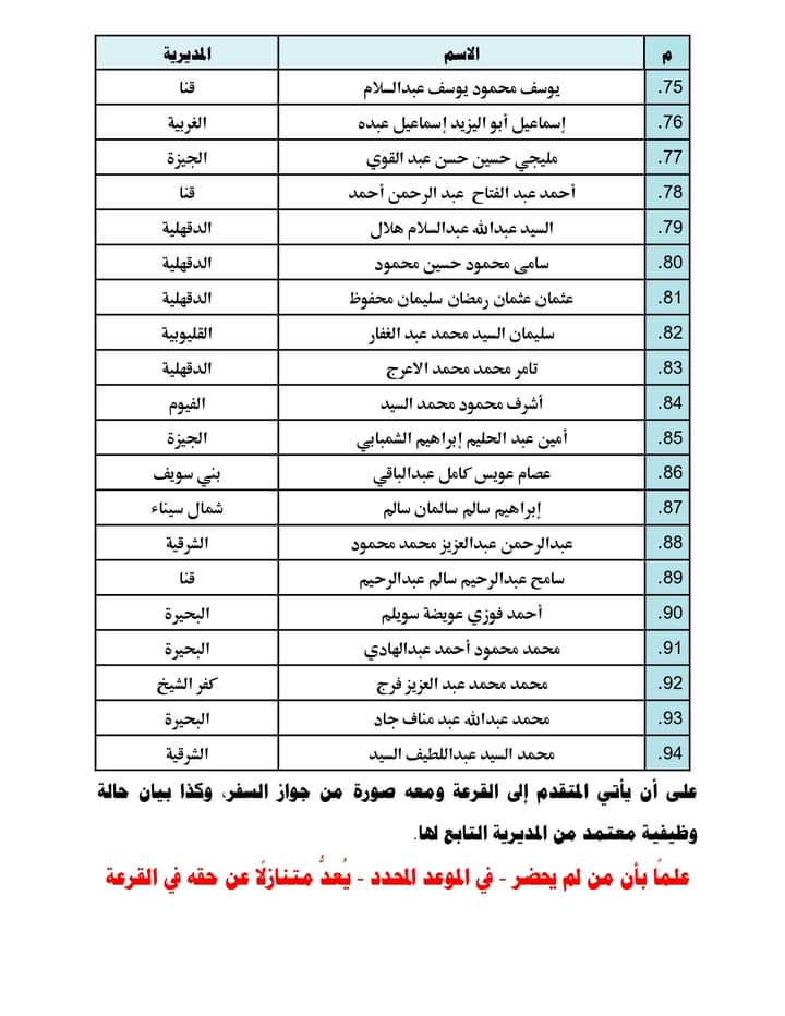 وتجرى القرعة في تمام الساعة الحادية عشرة صباحًا، علمًا بأنه تم تخصيص خمس تأشيرات لمن هم في سن التاسعة والخمسين أو الستين لعدم تكرار الفرصة في حقهم مرة أخرى، وعشر تأشيرات للمتقدمين دون مرافق، وعشر تأشيرات أخرى للمتقدمين بمرافقين، وهم كالتالي:
