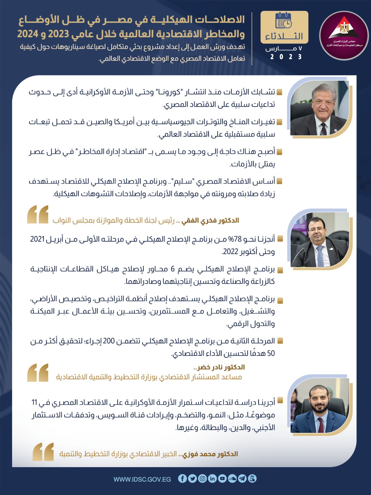 عقد مركز المعلومات ودعم اتخاذ القرار التابع لـ مجلس الوزراء، ورشة عمل عن الإصلاحات الهيكلية في مصر في ظل الأوضاع والمخاطر الاقتصادية العالمية خلال عامي 2023 و2024، حيث تهدف ورش العمل إلى إعداد مشروع بحثي متكامل لصياغة سيناريوهات حول كيفية تعامل الاقتصاد المصري مع الوضع الاقتصادي العالمي.