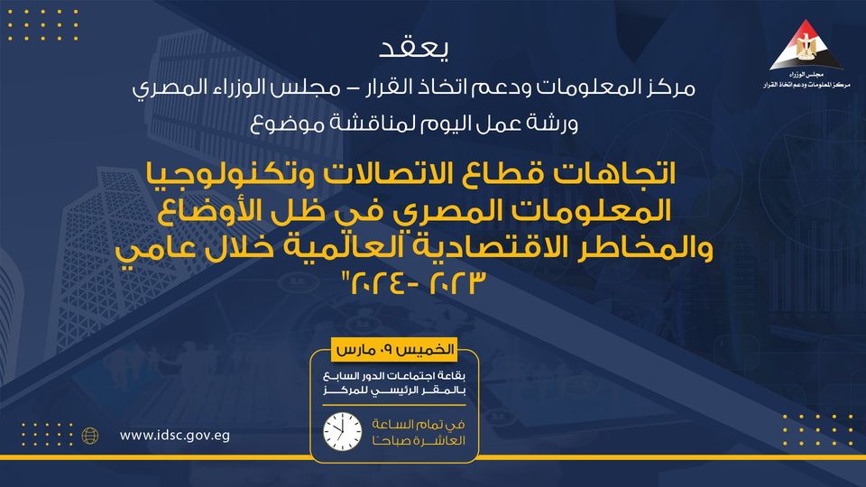 يعقد مركز المعلومات ودعم اتخاذ القرار التابع لـ مجلس الوزراء، اليوم الخميس، ورشة عمل جديدة للخبراء لمناقشة موضوع اتجاهات قطاع الاتصالات وتكنولوجيا المعلومات المصري في ظل الأوضاع والمخاطر الاقتصادية العالمية خلال عامي 2023 -2024.