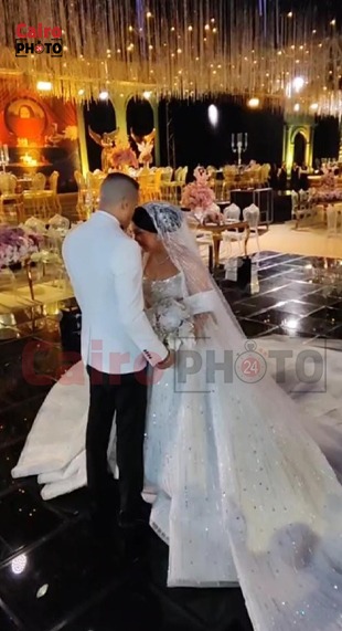 واختارت العروس فستان زفاف بصيحة الأوف شولدر، ومنفوش من الأسفل، بينما ارتدى حسن شاكوش بدلة بيضاء اللون.