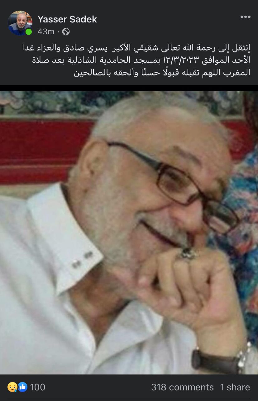 ياسر صادق يعلن وفاة شقيقه الأكبر.. والعزاء بمسجد الحامدية الشاذلية غدًا