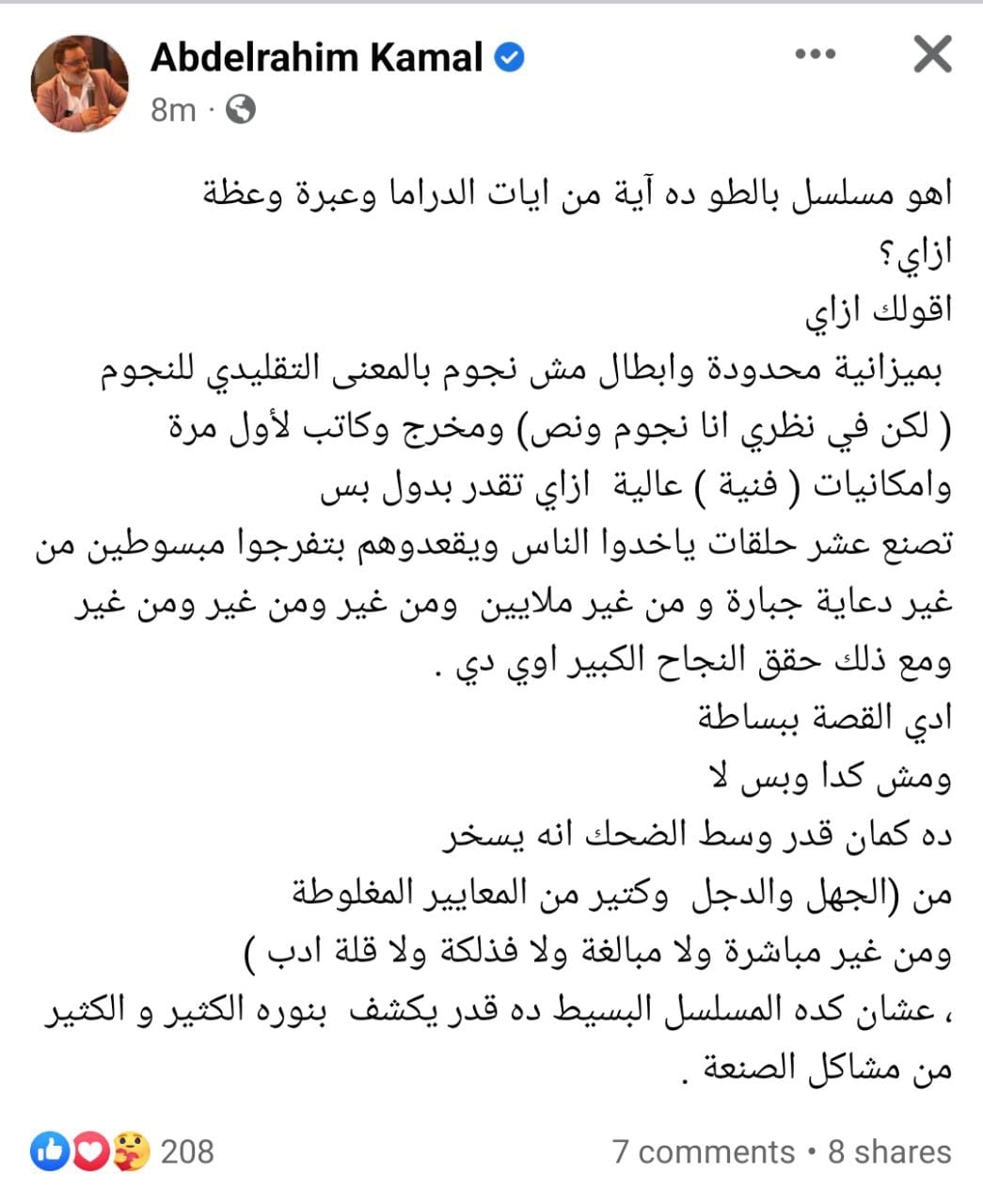 وكتب عبد الرحيم كمال على حسابه بـ فيس بوك منشورًا: أهو مسلسل بالطو ده آية من آيات الدراما وعبرة وعظة، ازاي؟ اقولك ازاي بميزانية محدودة وأبطال مش نجوم بالمعنى التقليدي للنجوم، لكن في نظري أنهم نجوم ونص.
