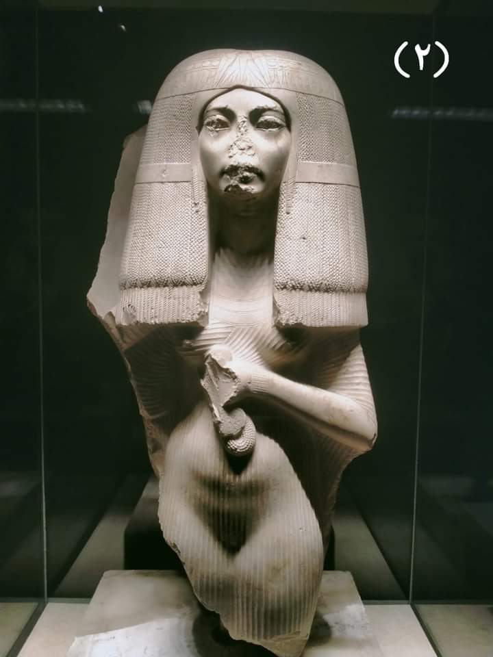 - تمثال زوجة نخت مين، ويعود إلى الدولة الحديثة الأسرة 18، صُنع من الحجر الجيري، ويعد هذا التمثال من أروع القطع التي صورت المرأه في مصر القديمة، وهي ترتدي ثوبًا شفافًا من الكتان الفاخر باروكة شعر كثيفة يزينها شريط من زهور اللوتس وتمسك بيدها اليسرى بقلادة المنيت الخاصة بالمعبودة حتحور.