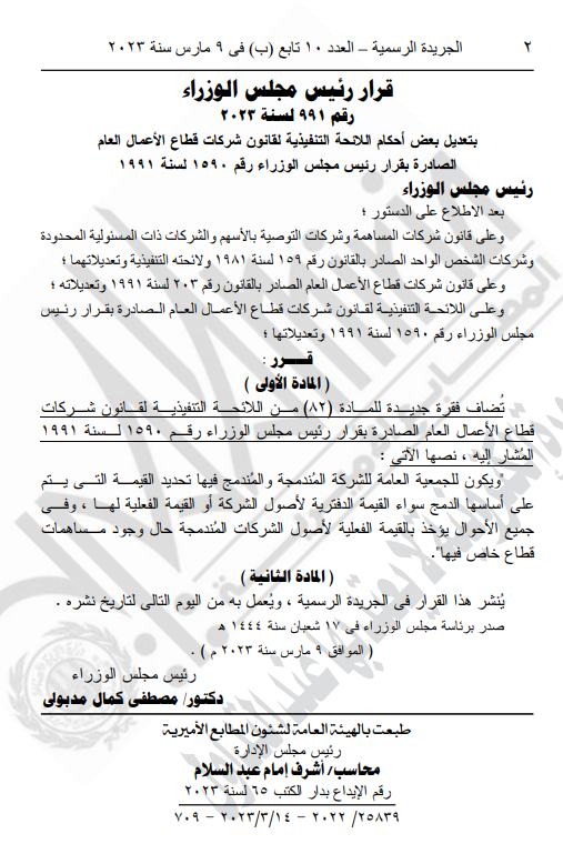 وتضمن نص القرار الآتي: بعد الاطلاع على الدستور؛ وعلى قانون شركات المساهمة وشركات التوصية بالأسهم والشركات ذات المسئولية المحدودة وشركات الشخص الواحد الصادر بالقانون رقم 159 لسنة1981 ولائحته التنفيذية وتعديلاتهما؛ وعلى قانون شركات قطاع الأعمال العام الصادر بالقانون رقم 203 لسنة 1991 وتعديلاته؛ وعلى اللائحة التنفيذية لقانون شركات قطاع الأعمال العام الصادرة بقرار رئيس مجلس الوزراء رقم 1590 لسنة 1991 وتعديلاتها؛