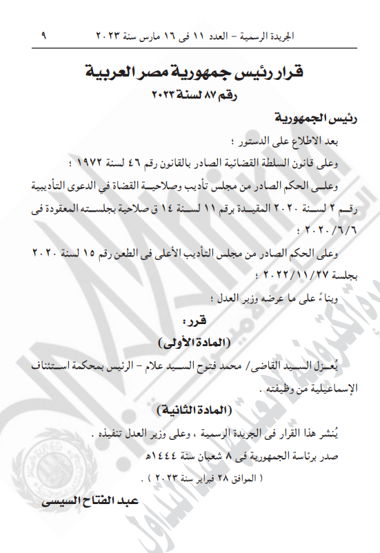 نشرت الجريدة الرسمية في عددها الصادر رقم 11 في 16 مارس سنة 2023 قرار رئيس الجمهورية رقم 87 لسنة 2023؛ بشأن عزل القاضي محمد فتوح السيد علام الرئيس بمحكمة استئناف الإسماعيلية من وظيفته.