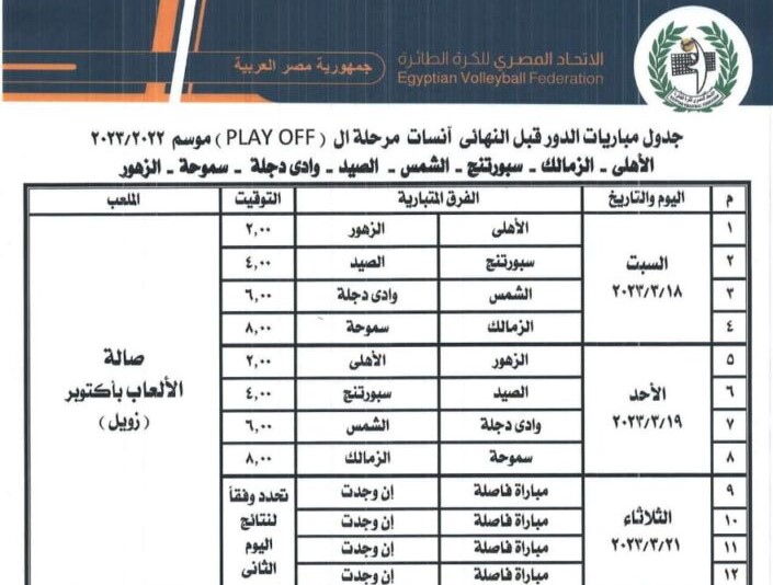 أعلنت لجنة المسابقات بـ الاتحاد المصري للكرة الطائرة مواعيد مباريات الدور قبل النهائي من بطولة دوري السوبر سيدات للموسم الرياضي 2022-2023.