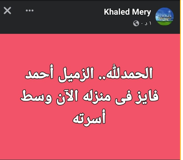 وقال ميري، خلال منشور له عبر صفحته الرسمية على موقع التواصل الاجتماعي، فيس بوك: الحمد لله، الزميل أحمد فايز في منزله الآن وسط أسرته.
