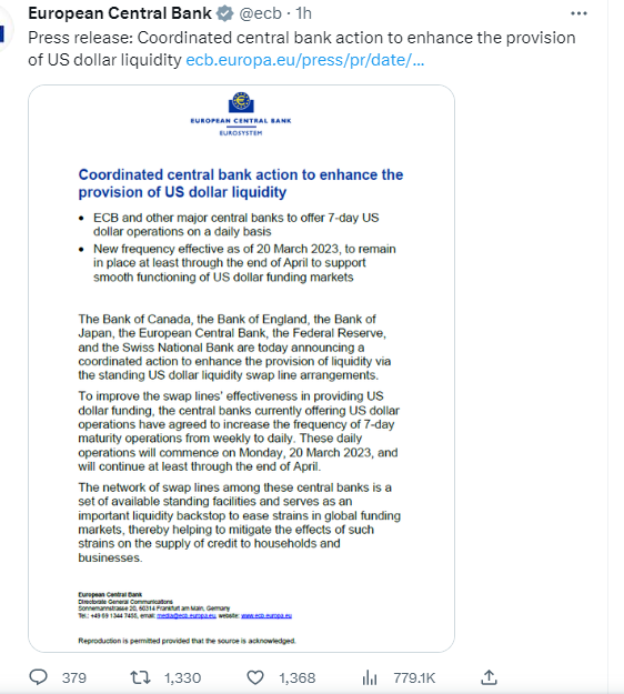 أعلن كل من بنك كندا، وبنك إنجلترا، وبنك اليابان، والبنك المركزي الأوروبي، والاحتياطي الفيدرالي الأمريكي، والبنك الوطني السويسري مساء اليوم عن إجراء منسق لتعزيز توفير السيولة عبر خطوط المبادلة بالدولار الأمريكي بين البنوك ويبدأ التفعيل اعتبارًا من يوم غدٍ ويستمر حتى نهاية شهر أبريل.