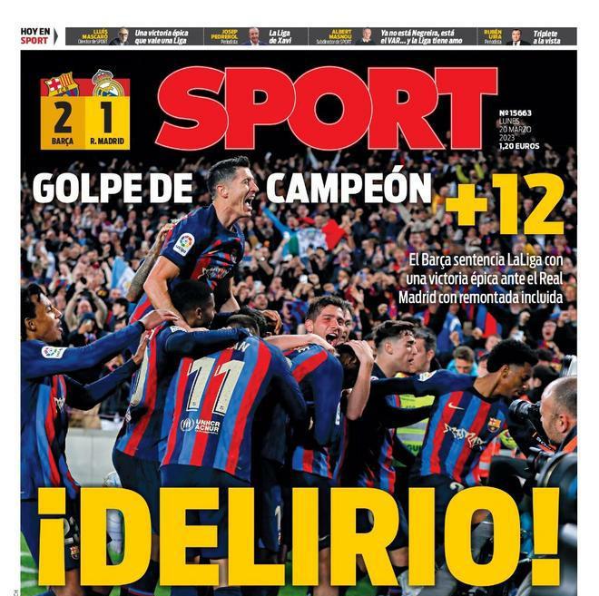 وقالت صخيفة سبورت لعدد اليوم، إن برشلونة أحدث حالة من الذهول بعد ريمونتادا الفوز على ريال مدريد بهدفين مقابل هدف في الدقائق الأخيرة، وجعل الفارق 12 نقطة ليقترب من الليجا.