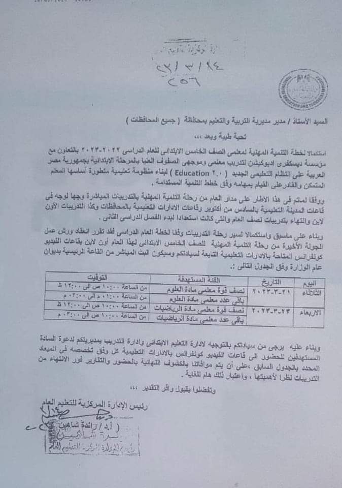 تبدأ وزارة التربية والتعليم والتعليم الفني، اليوم الثلاثاء، تدريب معلمي الصف الخامس الابتدائي في مادتي العلوم والرياضيات، من خلال قاعات الفيديو كونفرانس في الإدارات التعليمية، في إطار بناء منظومة تعليمية جديدة أساسها المعلم المتمكن القادر على أداء مهامه وفق خطة التنمية المستدامة.