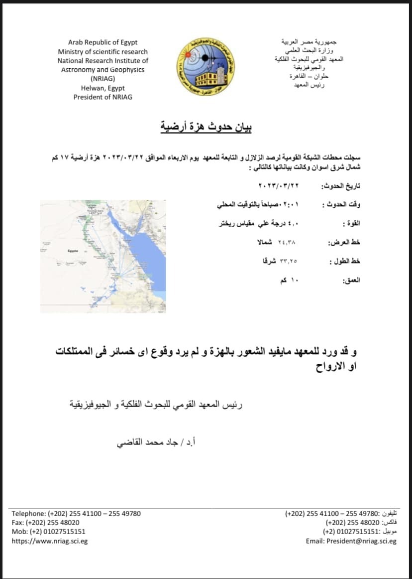 وفي وقت سابق كشف المعهد القومي للبحوث الفلكية والجيوفيزيقية، حقيقة وجود زلزال في مصر يوم الأربعاء 1 مارس 2023، مؤكدا أنه تلقى عدة تقارير من مواطنين عن شعورهم باهتزازات واضحة في نطاق القاهرة الكبرى، وتم رصد اهتزازات ناجمة عن أعمال إنشائية في المنطقة من خلال محطات الشبكة القومية للزلازل.