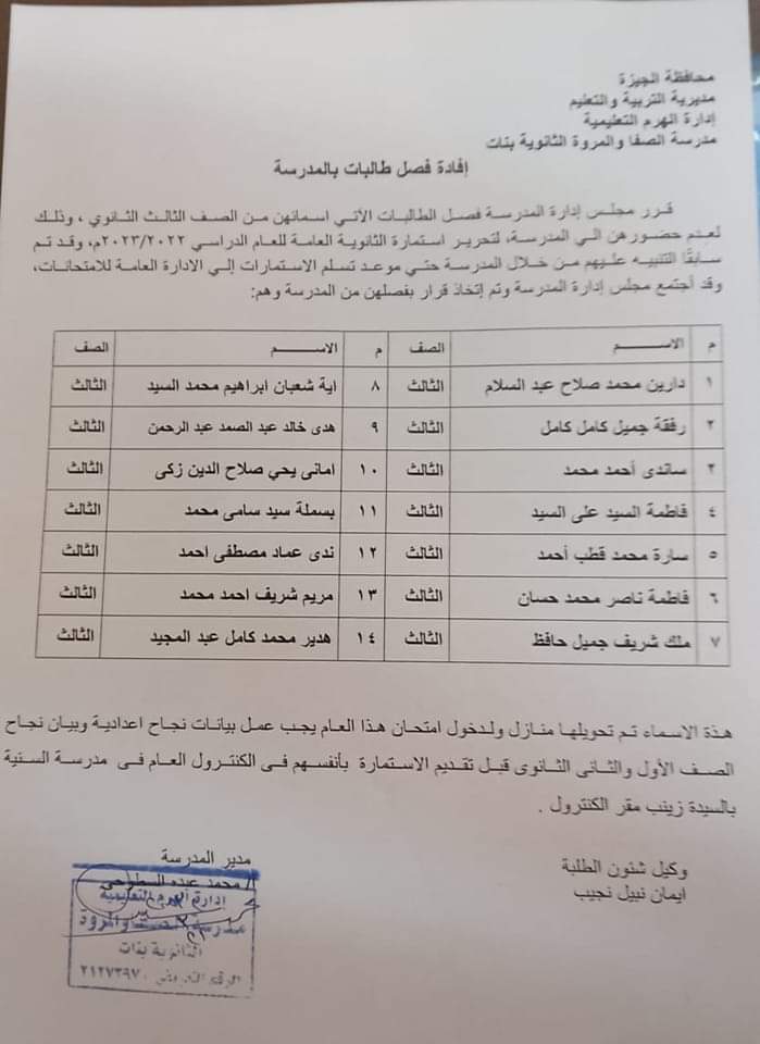 أعلنت مدرسة الصفا والمروة الثانوية بنات بإدارة الهرم، التابعة لمحافظة الجيزة، عبر صفحتها الرسمية على موقع التواصل الاجتماعي فيس بوك، فصل مجموعة من طالبات الصف الثالث الثانوي.