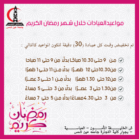 مواعيد عمل عيادات مستشفى عين شمس التخصصي خلال رمضان